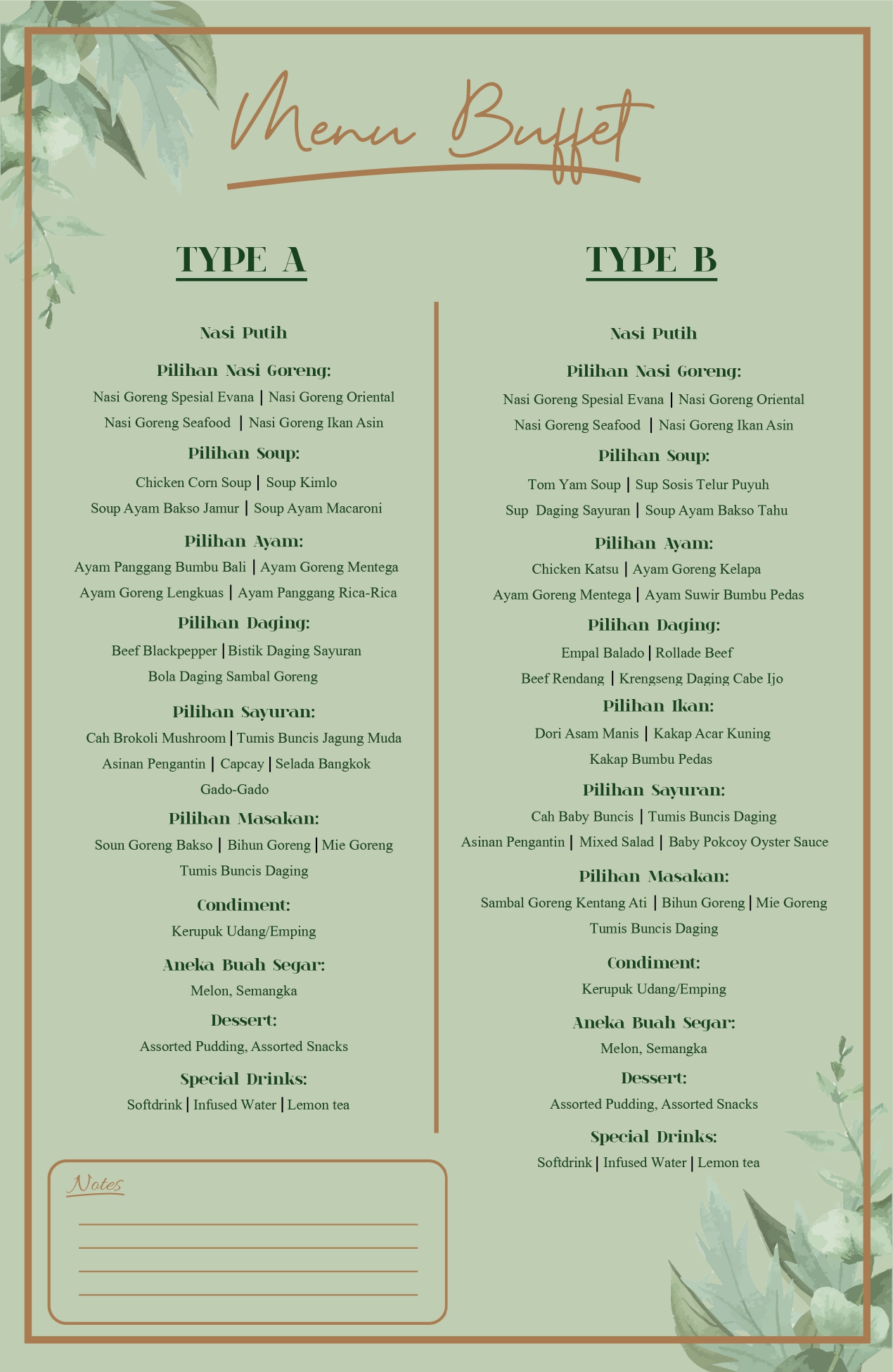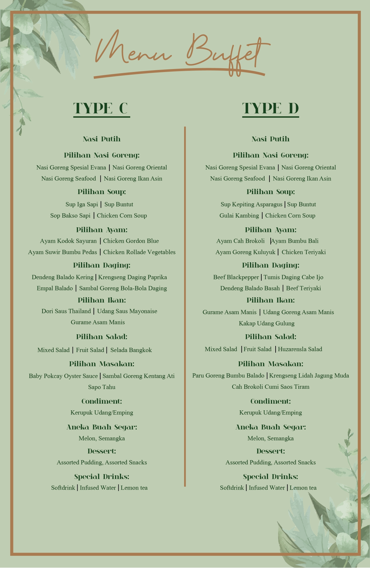 Menu Type A : Rp 80.000Menu Type B : Rp 85.000Menu Type C : Rp90.000Menu Type D : Rp100.000